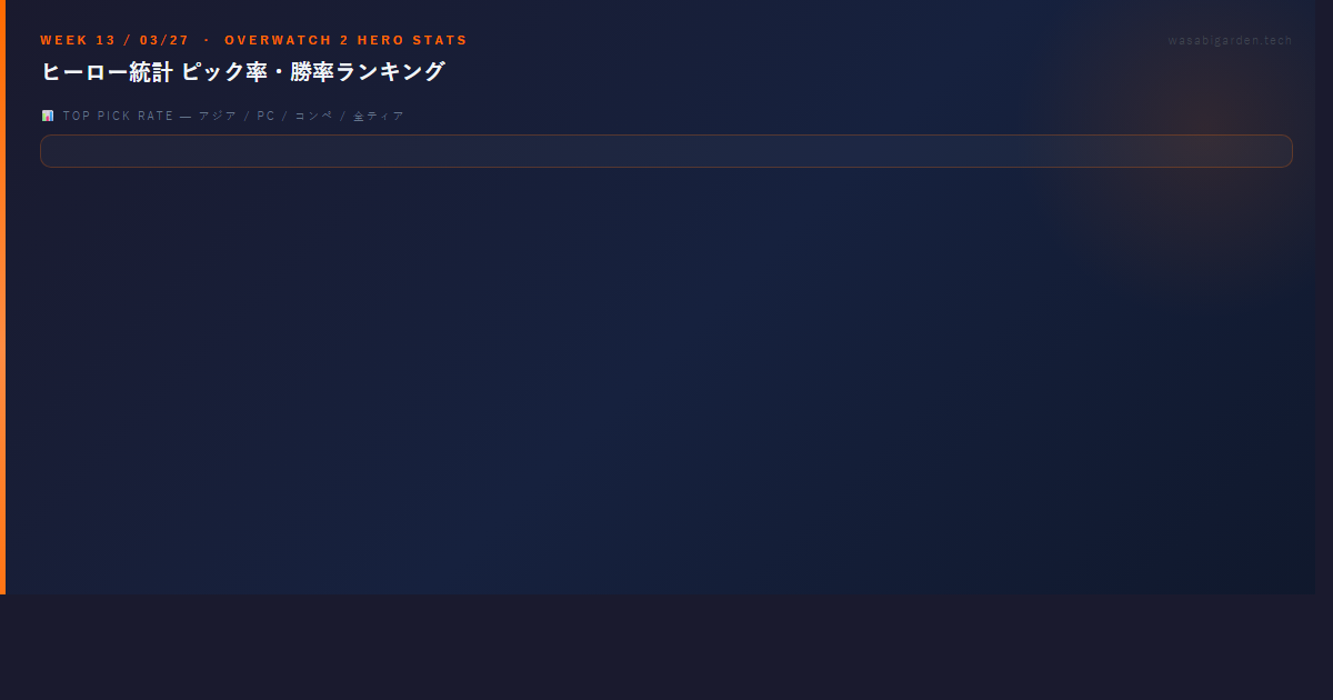 【第13週】OW2ヒーロー統計 ピック率・勝率ランキング (2026年03月27日)